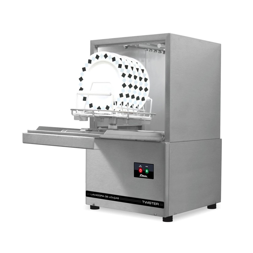 Operações: lavagem e enxágue, realizados através de braços superiores e inferiores. Higieniza pratos, talheres, copos, xícaras, taças de sorvete e outros recipientes. Aquecimentos da solução de lavagem e da água de enxágue: elétricos.
